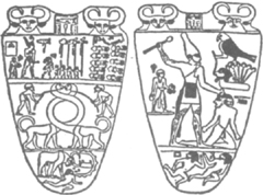 One of the first products of Egyptian art, the so-called “Narmer palette,” shown front and back. It is about 5,000 years old, and possibly shows the great Menes himself, founder of the first dynasty, after his victory over enemies from Lower Egypt.