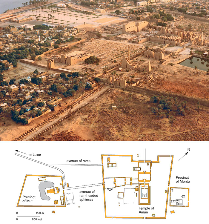 Aerial view of Karnak from the southeast showing the beginning of processional routes to Luxor Temple and to the temple complex of the goddess Mut, with a plan showing the relationship between the Amun and Mut temples. Kenneth Garrett/National Geographic Creative.