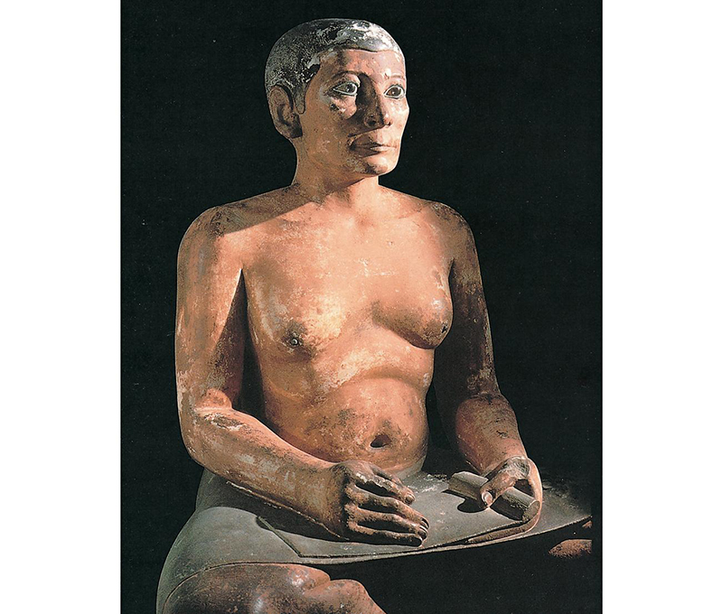 This Old Kingdom statue of a squatting scribe from Saqqara is notable because it shows an older man, rather than a youth at the beginning of his bureaucratic career. Musée du Louvre, Paris.