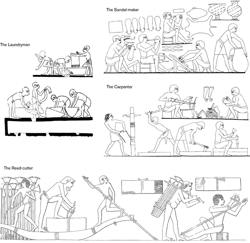 Tomb scenes showing a selection of the trades in ancient Egypt, including sandalmakers from the tomb of Rekhmire, carpenters from the tomb of Rekhmire, reed-cutters from the tomb of Puyemre, and laundrymen from the tomb of Ipuy. Steven Snape after Davies.