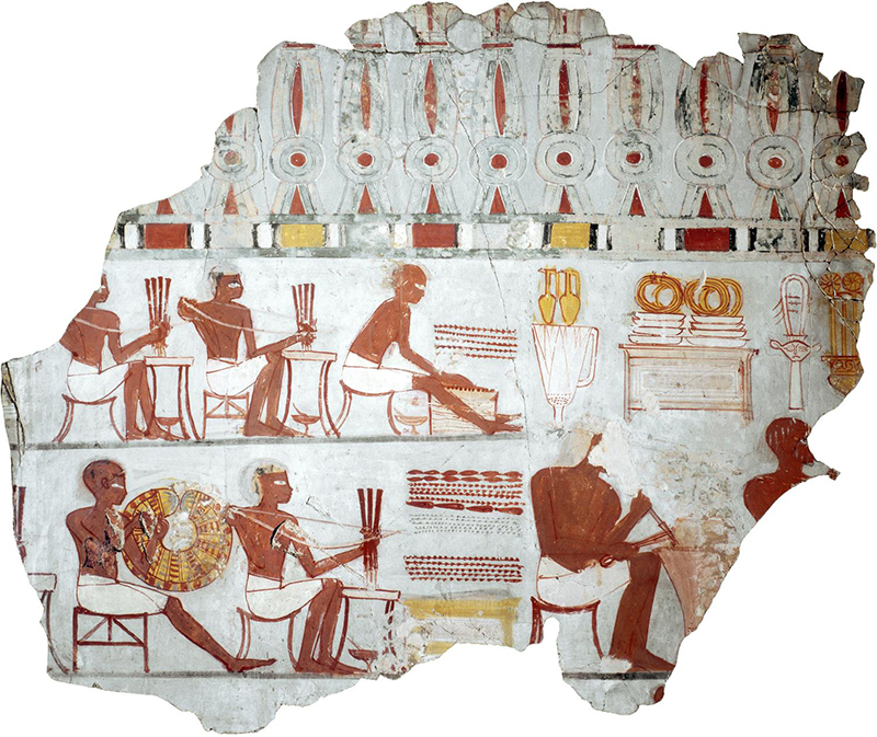 The types of workers depicted on the walls of private tombs could vary from producers of low value, high quantity items like mudbricks, to those of high-value materials, like these jewellers. British Museum, London.