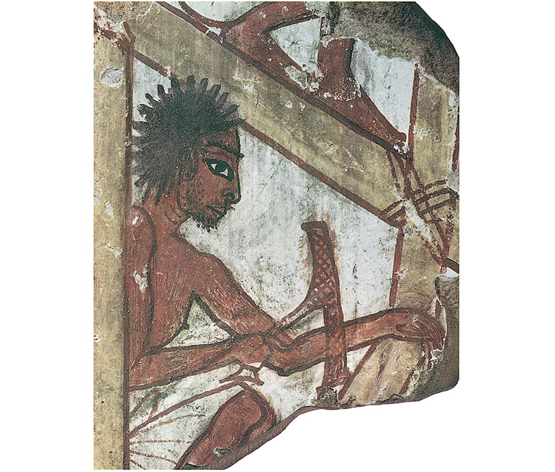An unshaven carpenter works with his hand-held adze on scaffolding for a building project, in a tomb-scene from the New Kingdom. Staatliche Museen zu Berlin.