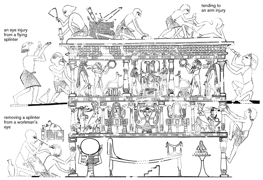 The tomb of Ipuy at Deir el-Medina contains this depiction of magnificently ornate funerary furniture, although the main theme of the scene seems to be the industrial injuries that might be suffered by the artisans involved in the production of that furniture. The annotations suggest what may be depicted. Steven Snape after Davies.