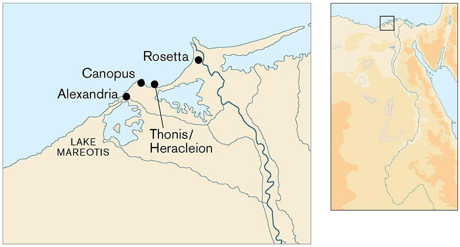 However, Alexandria was not the first city to be built on the Mediterranean coast of the Western Delta. Immediately to the east of Alexandria in Abukir Bay were the ports of Canopus and Thonis-Heracleion, strategically located close to the point where the Canopic Branch of the Nile met the Mediterranean and provided an important point of entry into Egypt for foreign, especially Greek, sailors. Both cities had developed an urban character that was part Egyptian and part Greek (the main temple at Thonis-Heracleion seems to have been dedicated to the Greek hero Heracles) in a manner that was very much the model for Alexandria itself.