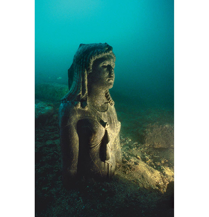 The torso of a queen represented as Isis, carved from black stone and with inlaid eyes, at the site of its discovery in Heracleion. The statue is thought to represent Cleopatra II or Cleopatra III. Other fragments completing this piece were found scattered over an area of 350 m (1,148 ft). © Franck Goddio/Hilti Foundation.