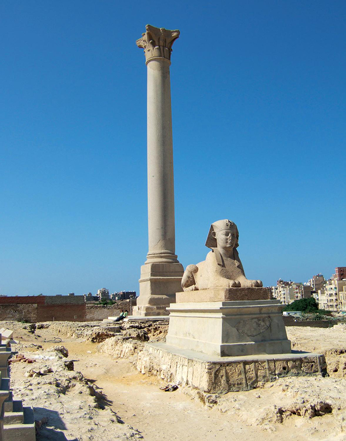 Other parts of the city are less easy to identify apart from a few archaeological survivals such as the Serapeum – the temple of the new Hellenistic-Egyptian god Serapis, which is in part of the city now marked by a triumphal column of the emperor Diocletian, erroneously referred to as ‘Pompey’s Pillar’.