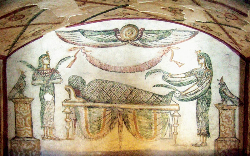 This wall-painting from a tomb in the Kom el-Shuqafa cemeteries at Alexandria is an excellent example of traditional Egyptian themes – in this case the body of the deceased protected by the goddesses Isis and Nephthys – depicted in Hellenistic style. Steven Snape.