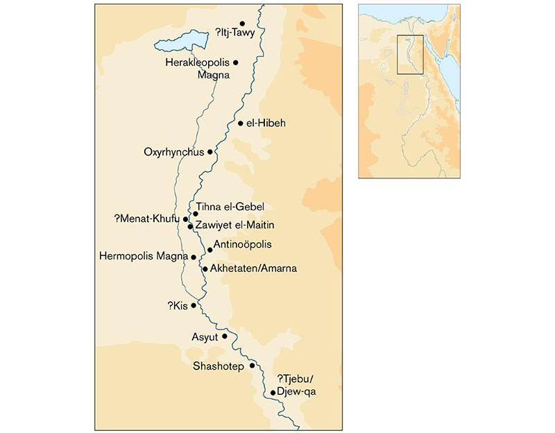 Although Hermopolis Magna has one of the largest surviving expanses of settlement remains in the Nile Valley between Memphis and Thebes, and the city of Amarna (the next city to be discussed in this Gazetteer) is perhaps our best example from any period, there is plenty of evidence to suggest that the stretch of the Nile between Asyut and Memphis contained other substantial towns and cities. Some of these are best represented by their latest, Graeco-Roman, phase, such as Hermopolis, and Oxyrhynchus, a site famous for its important finds of papyri. A particularly interesting example here is Antinoöpolis (modern Sheikh Abada) on the east bank of the Nile, close to Hermopolis, where a major refounding of the city after the reign of Hadrian mostly conceals earlier phases of occupation, apart from a temple built by Ramesses II.
