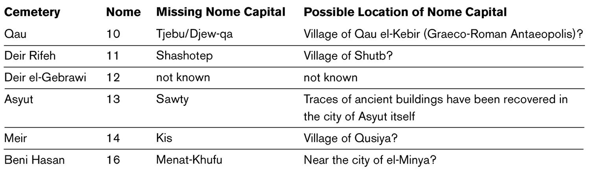 A significant number of ancient towns and cities in the Nile Valley are known to us only through the survival of the cemeteries that once served them. This is especially the case for the important rock-cut tombs of Middle and Southern Egypt where the steep face of cliffs close to the Nile provided an ideal location for elite tombs, high and dry above the floodplain that both nurtures and eventually obliterates traces of the settlements in which once lived the occupants of those tombs. While some examples of both cemetery and town do survive (e.g. the Qubbet el-Hawa cemetery and the town on Elephantine Island) these tend to be exceptional. Especially for the period from the late Old Kingdom to the end of the Middle Kingdom, the rock-cut cemeteries of nome leaders provide the best indication of the existence, and possible nearby location, of what was usually the most important town of the district, the nome capital.