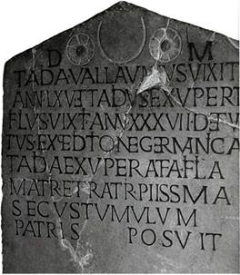 (Above) A stone found near the fortress at Caerleon commemorating a soldier’s wife, Tadia Vallaunius, who died at the age of 65, as well as her son Tadius Exuperatus