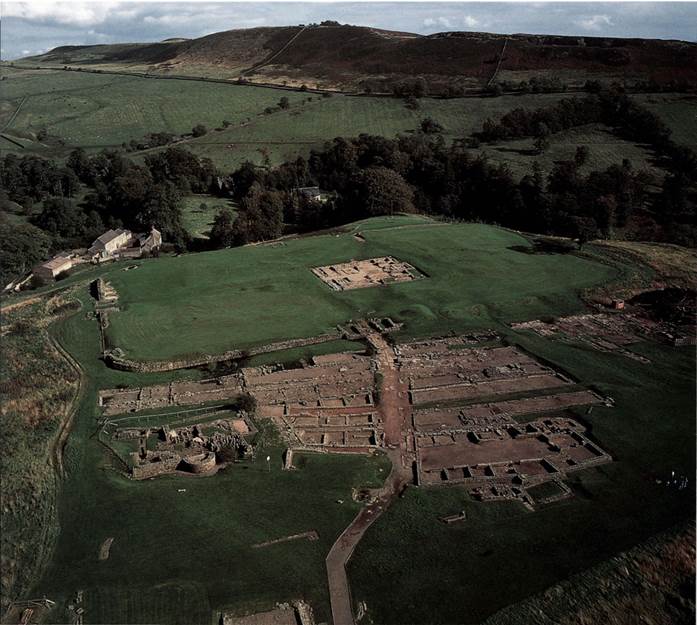Aerial view of the fori at Vindolanda with the civilian vicus in the foreground. The writing tablets from this site have given some insight into the social life of senior officers’ wives.