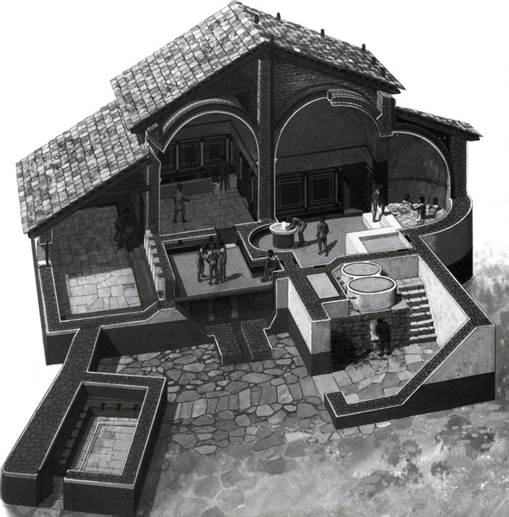 (Below) A reconstruction of the bath house at Vindolanda shows the various rooms with water heated to different temperatures For the Romans bathing was a very sociable experience