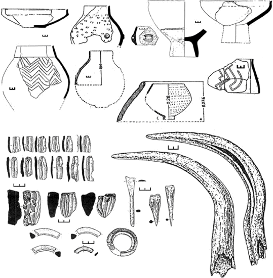 Figure 8.2 Criş.-culture ceramic shapes and decorative motifs (top half), flint blades and cores (left), antler and bone tools (right), and ceramic rings (bottom) dated 5700–5300 BCE. After Dergachev 1999; and Ursulescu 1984.