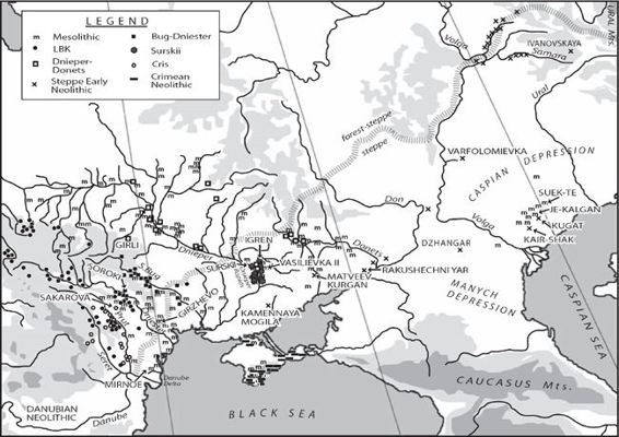 Figure 8.3 Mesolithic and Neolithic sites from the Carpathian Mountains to the Ural River.