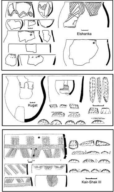 Figure 8.4 Top: Early Neolithic ceramics of Elshanka type on the middle Volga (7000–6500 BCE); middle: ceramics and flint tools from Kugat (perhaps 6000 BCE), North Caspian; bottom: ceramics and flint tools from Kair-Shak III (5700–5600 BCE) North Caspian. After (top) Mamonov 1995; and (middle and bottom) Barynkin and Kozin 1998.
