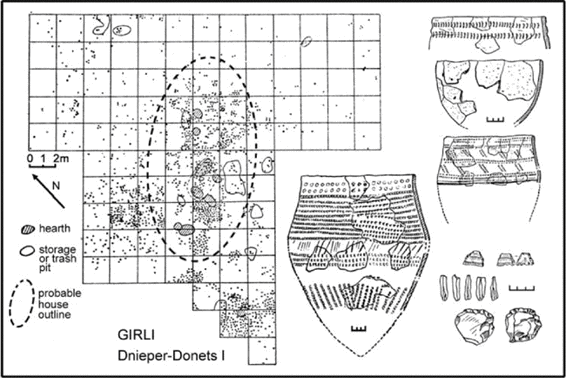 Campsites of foragers who made Dnieper-Donets I (DDI) pottery have been excavated on the southern borders of the Pripet Marshes in the northwest and in the middle Donets valley in the east, or over much of the forest-steppe and northern steppe zone of Ukraine. At Girli (figure 8.6) on the upper Teterev River near Zhitomir, west of Kiev, a DDI settlement contained eight hearths arranged in a northeast-southwest line of four pairs, each pair about 2–3 m apart, perhaps representing a shelter some 14 m long for four families. Around the hearths were thirty-six hundred flint tools including microlithic blades, and sherds of point-based pots decorated with comb-stamped and pricked impressions. The food economy depended on hunting and gathering. Girli was located on a trail between the Dnieper and South Bug rivers, and the pottery was similar in shape and decoration to some Bug-Dniester ceramics of the middle or Samchin phase. But DDI sites did not contain domesticated animals or plants, or even polished stone axes like those of the Criş and late Bug-Dniester cultures; DDI axes were still chipped from large pieces of flint.29