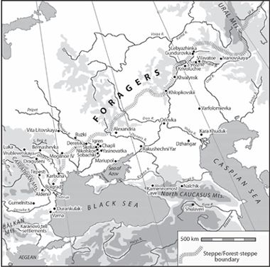 Many archaeologists have wondered if domesticated cattle and sheep might have entered the steppes through the Eneolithic farmers of the Caucasus as well as from Old Europe.28 Farming cultures had spread from the Near East into the southern Caucasus Mountains (Shulaveri, Arukhlo, and Shengavit) by 5800–5600 BCE. But these earliest farming communities in the Caucasus were not widespread; they remained concentrated in a few riverbottom locations in the upper Kura and Araxes River valleys. No bridging sites linked them to the distant European steppes, more than 500 km to the north and west. The permanently glaciated North Caucasus Mountains, the highest and most impassable mountain range in Europe, stood between them and the steppes. The bread wheats(Triticum aestivum) preferred in the Caucasus were less tolerant of drought conditions than the hulled wheats (emmer, einkorn) preferred by Criş, Linear Pottery, and Bug-Dniester cultivators. The botanist Zoya Yanushevich observed that the cultivated cereals that appeared in Bug-Dniester sites and later in the Pontic-Caspian steppe river valleys were a Balkan/Danubian crop suite, not a Caucasian crop suite.29 Nor is there an obvious stylistic connection between the pottery or artifacts of the earliest Caucasian farmers at Shulaveri and those of the earliest herders in the steppes off to the north. If I had to guess at the linguistic identity of the first Eneolithic farmers at Shulaveri, I would link them with the ancestors of the Kartvelian language family.