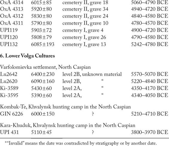 A prehistoric cemetery was discovered at Khvalynsk in 1977 on the west bank of the middle Volga. Threatened by the water impounded behind a Volga dam, it was excavated by teams led by Igor Vasiliev of Samara (figure 9.7). Its location has since been completely destroyed by bank erosion. Sites of the Khvalynsk type are now known from the Samara region southward along the banks of the Volga into the Caspian Depression and the Ryn Peski desert in the south. The characteristic pottery included open bowls and bag-like, round-bottomed pots, thick-walled and shell-tempered, with very distinctive sharply everted thick “collars” around the rims. They were densely embellished with bands of pricked and comb-stamped decoration that often covered the entire exterior surface. Early Khvalynsk, well documented at the Khvalynsk cemetery, began around 4700–4600 BCE in the middle Volga region (after adjusting the dates downward for the 15N content of the humnan bones on which the dates were measured). Late Khvalynsk on the lower Volga is dated 3900–3800 BCE at the site of Kara-Khuduk but probably survived even longer than this on the lower Volga.22