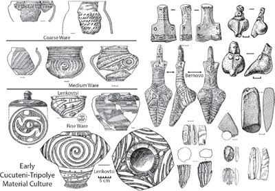 Cucuteni-Tripolye is named after two archaeological sites: Cucuteni, discovered in eastern Romania in 1909, and Tripolye, discovered in central Ukraine in 1899. Romanian archaeologists use the name Cucuteni and Ukrainians use Tripolye, each with its own system of internal chronological divisions, so we must use cumbersome labels like Pre-Cucuteni III/Tripolye A to refer to a single prehistoric culture. There is a Borges-like dreaminess to the Cucuteni pottery sequence: one phase (Cucuteni C) is not a phase at all but rather a type of pottery probably made outside the Cucuteni-Tripolye culture; another phase (Cucuteni A1) was defined before it was found, and never was found; still another (Cucteni A5) was created in 1963 as a challenge for future scholars, and is now largely forgotten; and the whole sequence was first defined on the assumption, later proved wrong, that the Cucuteni A phase was the oldest, so later archaeologists had to invent the Pre-Cucuteni phases I, II, and III, one of which (Pre-Cucuteni I) might not exist. The positive side of this obsession with pottery types and phases is that the pottery is known and studied in minute detail.10