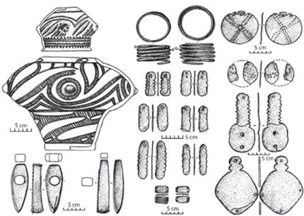 Center: grave goods from the Khvalynsk cemetery—copper rings and bracelets, polished stone mace heads, polished stone bracelet, Cardium shell ornaments, boars tusk chest ornaments, flint blades, and bifiacial projectile points. Bottom: shell-tempered pottery from the Khvalynsk cemetery. After Agapov, Vasiliev, and Pestrikova 1990; and Ryndina 1998, Figure 31.