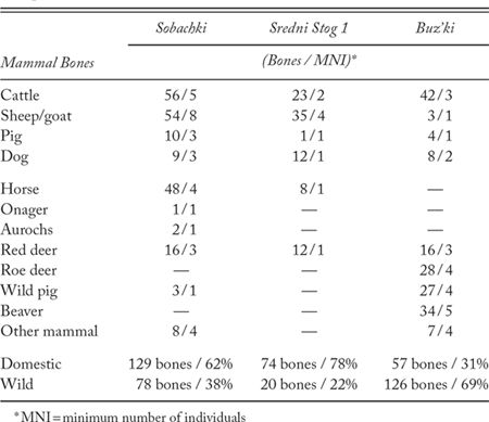 Four Dnieper-Donets II settlement sites in the Dnieper valley have been studied by zoologists—Surskii, Sredni Stog 1, and Sobachki in the steppe zone near the Rapids; and Buz’ki in the moister forest-steppe to the north (table 9.2). Domesticated cattle, sheep/goat, and pig accounted for 30–75% of the animal bones in these settlements. Sheep/goat contributed more than 50% of the bones at Sredni Stog 1 and 26% at Sobachki. Sheep finally were accepted into the meat diet in the steppes. Perhaps they were already being plucked for felt making; the vocabulary for wool might have first appeared among Pre-Proto-Indo-European speakers at about this time. Wild horses were the most important game (?) animal at Sredni Stog 1 and Sobachki, whereas red deer, roe deer, wild pig, and beaver were hunted in the more forested parts of the river at Buz’ki and Surskii 2–4. Fishing net weights and hooks suggest that fish remained important. This is confirmed by levels of 15N in the bones of people who lived on the Dnieper Rapids, which indicate a meat diet containing more than 50% fish. Domesticated cattle, pig, and sheep bones occurred in all DDII settlements and in several cemeteries, and constituted more than half the bones at two settlement sites (Sredni Stog I and Sobachki) in the steppe zone. Domesticated animals seem indeed to have been an important addition to the diet around the Dnieper Rapids.17