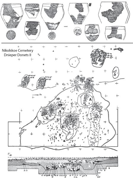 Figure 9.5 Dnieper-Donets II cemetery at Nikol’skoe with funerary ceramics. Pits A,B,G, and V were in an area deeply stained with red ochre. The other five burial pits were on a slightly higher elevation. Broken pots and animal bones were found near the cluster of rocks in the center. After Telegin 1991, figures 10, 20; and Telegin 1968, figure 27.