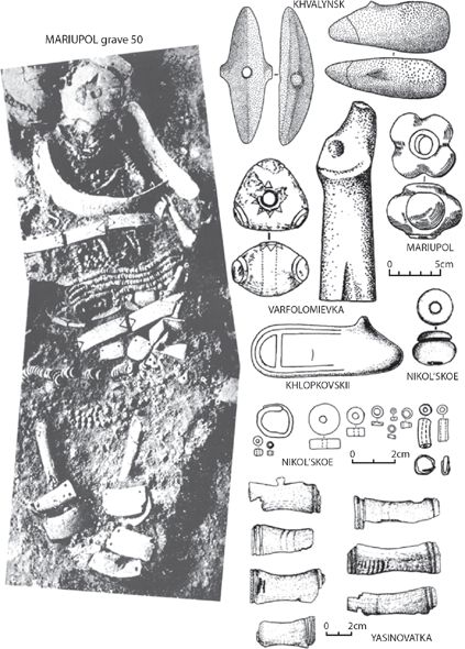 Figure 9.6 Ornaments and symbols of power in the Early Eneolithic, from Dnieper-Donets II graves, Khvalynsk, and Varfolomievka. The photo of grave 50 at Mariupol, skull at the top, is adapted from Gimbutas 1956, plate 8. The beads from Nikol’skoe include two copper beads and a copper ring on the left, and a gold ring on the lower right. The other beads are polished and drilled stone. The maces from Mariupol and Nikol’skoe, and beads from Nikol’skoe are after Telegin 1991, figures 29, 38; and Telegin and Potekhina 1987, figure 39. The Varfolomievka mace (or pestle?) is after Yudin 1988, figure 2; Khvalynsk maces are after Agapov, Vasliev, and Pestrikova 1990, figure 24. Boars-tusk plaques, at the bottom, are after Telegin 1991, figure 38.