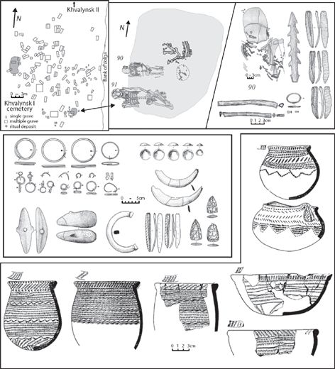 Figure 9.7 Khvalynsk cemetery and grave gifts. Grave 90 contained copper beads and rings, a harpoon, flint blades, and a bird-bone tube. Both graves (90 and 91) were partly covered by Sacrificial Deposit 4 with the bones from a horse, a sheep, and a cow.