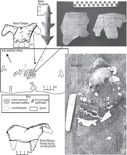 Samara people created formal cemeteries (figure 9.8). The cemetery at S’yezzhe (see-YOZH-yay) contained nine burials in an extended position on their backs, different from the Khvalynsk position and more like that of DDII. Above the graves at the level of the original ground surface was a ritual deposit of red ochre, broken pottery, shell beads, a bone harpoon, and the skulls and lower leg bones (astragali and phalanges) of two horses—funeral-feast deposits like the above-grave deposits at Khvalynsk. S’yezzhe had the oldest horse head-and-hoof deposit in the steppes. Near the horse head-and-hoof deposit, but outside the area of ochre-stained soil, were two figurines of horses carved on flat pieces of bone, similar to others found at Varfolomievka, and one bone figurine of a bull. The S’yezzhe people wore boar’s-tusk plaques like those of the Dnieper-Donets II culture, one of which was shaped exactly like one found at the DDII cemetery of Yasinovatka in the Dnieper valley.35