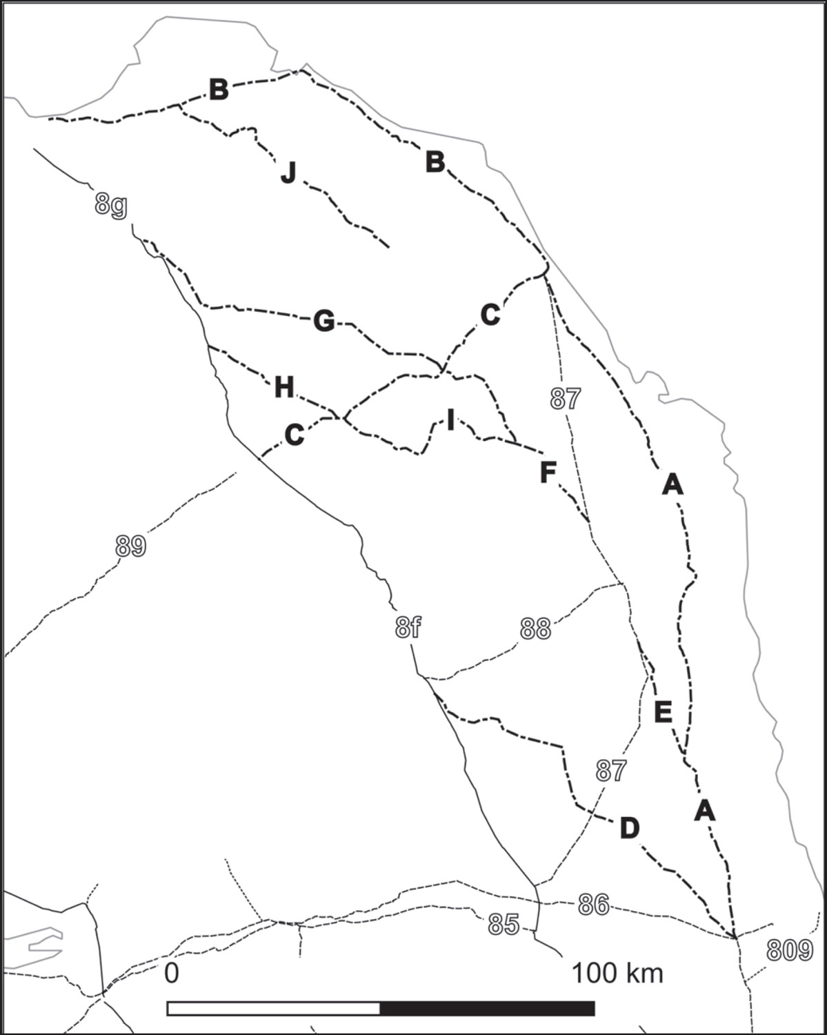 The road leaves Tweedmouth near the putative site of the medieval castle and its route is marked first by field boundaries before being taken up by the turnpike road through East Ord and continuing towards Thornton Park. Crossing the Till at Twizel, it proceeded through Donaldson’s Lodge on its way to Cornhill and a junction with route F. Passing next through Wark, Carham, and Sprouston, it must have arrived at Maxwellheugh prior to crossing the Teviot somewhere near Roxburgh castle. It probably continued past Trows and Rutherford, ultimately joining Margary 8 (Dere Street). A further continuation to the west seems likely to join Margary 89, traced to just 3.6 km to the south-west of the main road.