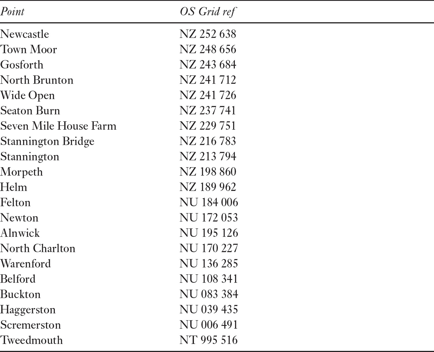 The route approximates closely with that surveyed by Ogilby. Having crossed the Tyne somewhere in the vicinity of the swing bridge, the road probably headed up Pilgrim Street and thence onto Town Moor where a straight alignment took it through Gosforth, North Brunton, Wide Open, Seaton Burn, then Seven Mile House Farm, before crossing the Blythe near Stannington Bridge, and on through Stannington. The course through Morpeth itself is unclear but the alignment continues to the north of it through Helm, where the Ogilby line probably departs from it but the alignment is still marked by field boundaries between Helm and Eshott airfield. Felton, Newton, Alnwick, Charlton, Wainford, Belford, Buckton, Haggerston, Scremerston, and so to Tweedmouth. The modern A1 veers off the Ogilby line just south of Helm and does not rejoin it until near Shilbottle, having been straightened over this section (and in some places looking more Roman than the likely Roman alignment). Other bypasses occur around Alnwick and Belford.5