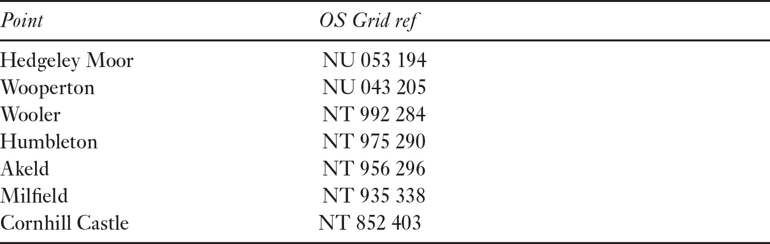 From the junction at Percy’s Cross on Hedgeley Moor, the route heads through Wooperton and on to Wooler where it changes to a more easterly course. Passing Humbleton it reaches Akeld and changes back to a more northerly course again, although the continuation of a branch road through Kirknewton and Kirk Yetholm may be indicated by its use by Edward I in August 1304 on his way from Jedburgh to Bolton in Northumberland. The main road continues in a north-westerly direction through Milfield, after which it continues to Cornhill, perhaps by the modern route of the A697, although a more direct north-easterly route passing to the south of Branxton and avoiding that dog-leg is also a possibility. As it nears Cornhill it continues on to cross the Tweed near Cornhill Castle.