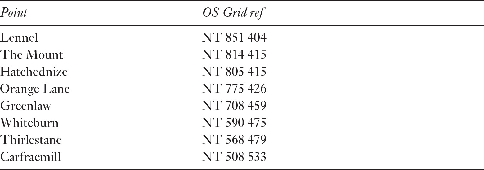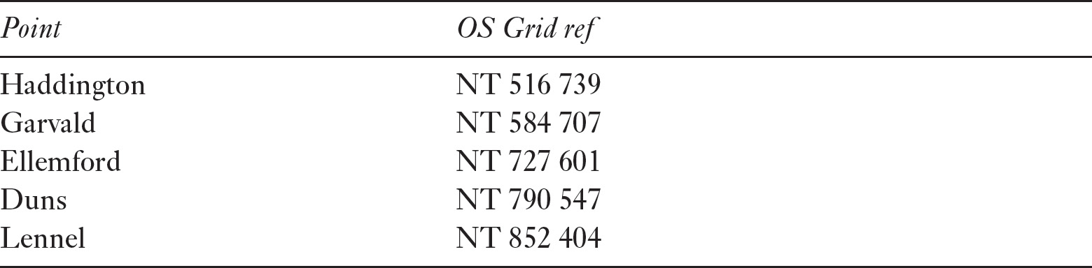 The route evidently began at Haddington and crossed the Lammermuirs via Ellemford and Duns, probably leading down to a crossing of the Tweed near Coldstream. Between Haddington and Ellemford the route is very unclear, but may have passed Garvald before crossing the moors north-west of Ellemford. A Whitchester place-name to the south-east of Ellemford is of interest, as is Chesters near Whitelaw Hill, as well as Stoneypath to the east of Garvald.32