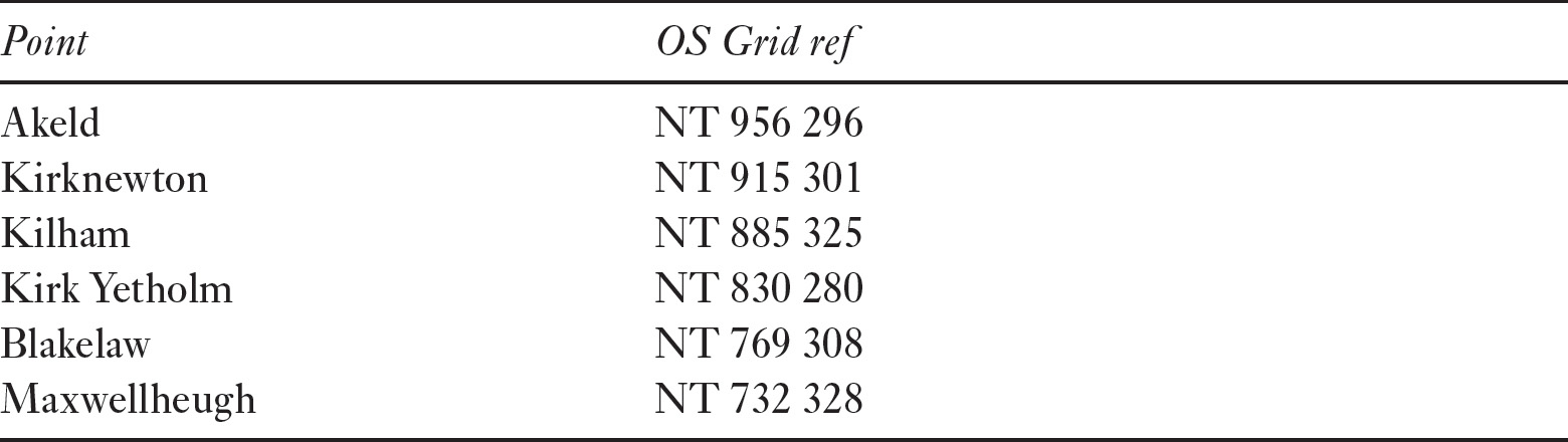 This route continues the line of Route F from Akeld and probably passed through Kirknewton, Kilham, Kirk Yetholm, Blakelaw and finally Maxwellheugh. There is no place-name evidence to assist in the identification of the course, but the generalities of the route seem likely.
