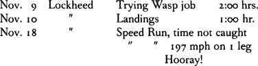 In a logbook Amelia had started on July 20, she wrote that she tried out a new Vega in Burbank on November 9, the day after she arrived in Los Angeles. However, she was no more accurate in keeping a written account of her flight time than she had been as a novice, writing to Bert Kinner for an estimate. At the beginning of the log book she wrote that her total time to date, that is to July 20, 1929, was 559 hours and 46 minutes. It is difficult to see how she arrived at such a precise figure. The woman who was meticulous in financial matters, keeping records and receipts and demanding them from others, was amazingly casual in recording flight time and destinations. She had written in the new book that she flew her first Vega, “the clunk” she bought in New York, to Los Angeles between August 2 and August 8. No mileage, time, or stops were recorded. For her second Vega, which she flew in the derby, she made entries like the following one: