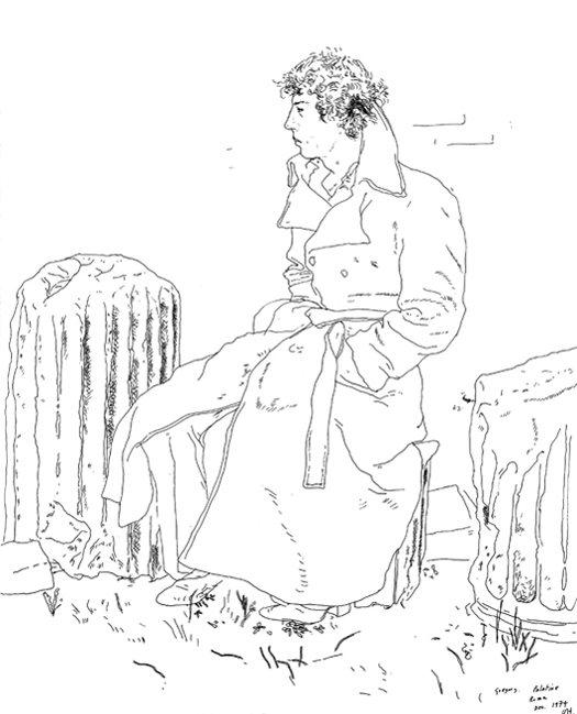 It was on their trip to see Intermezzo that Hockney realised how his feelings for Evans had deepened. “Gregory fell asleep on the train returning from Glyndebourne,” he later wrote, “and I thought he looked very sweet because he was wearing a suit, something he does not normally wear. In most pictures he is very casually dressed, but for Glyndebourne he borrowed a suit from Ossie Clark. I thought he looked very handsome and suddenly saw him in a slightly different way …”53 They went to Rome for a few days, where Hockney drew his new lover sitting among the ruins on the Palatine hill. “It was the first time I’d ever been to Italy,” Evans remembers, “so it was very exciting. We didn’t do that much, because we weren’t there for very long, and most of the time I ended up posing for him. He drew me a lot in those days, and he always seemed to capture something in me that I can relate to. He presented a side of me that I was unaware of, and the drawings gave me a bit of identity that I didn’t have before, that I hadn’t seen.”54