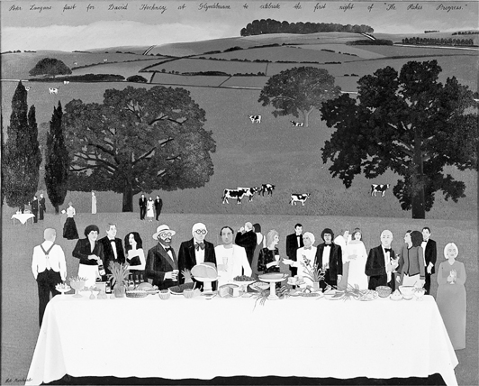 Rodney Milne, however, writing in the Spectator, hated it, and began his review: “By the end of the evening I was so out of sympathy with the new production of The Rake’s Progress…that I asked my Aunt Jennifer, who came as my guest, to write the notice.”75 There followed a pastiche review by this imaginary aunt. “It was a lovely warm evening as we motored down, and we arrived in good time to walk round the gardens, which were looking simply gorgeous. It was Midsummer’s Night, of course, and one half expected to see fairies popping out of their little holes and gambolling around the shrubbery. I was terribly excited to see so many people from that picture about David Hockney … I recognized that nice-looking Peter Something-or-other, the co-star, wearing a white suit … there was Celia Birtwistle looking radiant (I’m told she absolutely loved the opera)…Then there was that New York art dealer with the beard, Henry Kissinger, I think … and Udo Keir, who is the new Warhol superstar … Just before we went in, we passed a pretty gel who seemed a bit under the weather. Someone thought she’d tripped over, but I expect she’d taken something that didn’t agree with her … Rodney says I must mention the opera. He thinks it’s a precious pastiche, as pointless as it is puerile, but he will get carried away with alliteration.”76