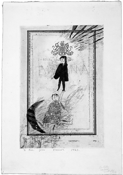 The result was that Hockney’s hurriedly written thesis on Fauvism was not considered acceptable. “Dear Hockney,” wrote the registrar on 11 April 1962, “You will have noticed from the Results Lists which have been posted on the School’s notice board that you have failed the Final Examination in General Studies which means that irrespective of the result of your professional work you will not be eligible for the award of the College Diploma at the Convocation Ceremony to be held on 12th July.”51 The letter went on to say that if he was prepared to carry out additional work and be re-examined, then it would be possible for him to gain the diploma if the new work was considered satisfactory. Hockney, however, was cocky and confident enough not to care, especially since he now had a dealer. “In a way I was set up professionally even before the diploma show,” he remembers, “so when they were going on about diplomas, I thought, ‘Well, Kasmin isn’t asking to see a diploma.’ I thought, ‘Why bother about all this in painting of all things?’ It just seemed ridiculous. I was confident enough to just simply laugh at it.”52 With characteristic wit and self-assurance, his response to the whole episode was to design his own diploma in the form of a coloured etching depicting, beneath the coat of arms of the college, a seated Robin Darwin holding up a two-faced Michael Kullman. The image is contained within a frame which rests upon the backs of five tiny figures, representing Hockney and four other failed students, bent double beneath its weight, bowing in shame.
