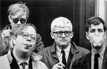 Left to right: Andy Warhol, Henry Geldzahler, David Hockney, Jeff Goodman, 1963 (illustration credit 5.1)