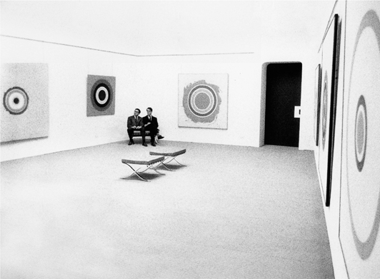 The finished space was like a temple, with sophisticated fluorescent lighting designed to boost and balance the daylight, which came from a lantern in the roof, electrically operated louvred blinds, and state-of-the-art flooring, a kind of hard-wearing rubbery linoleum, made by Pirelli. (Annoyingly for Kasmin, large numbers of people turned up to look at the floor rather than the pictures.) The Kasmin Gallery opened on 17 April 1963 with a show of concentric circle paintings by Kenneth Noland, Kasmin’s favourite artist. It was a glittering evening during which the art world rubbed shoulders with the worlds of society and the aristocracy, and was followed by a party given by Claus von Bülow in Belgrave Square. “First show over,” Kasmin wrote to the American art critic Clement Greenberg, “and trying to assess the effect here—great attendance and discussion; generally vapid reviews … the world of painters and students very excited and keen; the general public mostly discussed the beauty of the gallery and its lighting—concrete results are a couple of sales and the Tate discussing a possible purchase … Nevertheless it was my idea of a success.”47