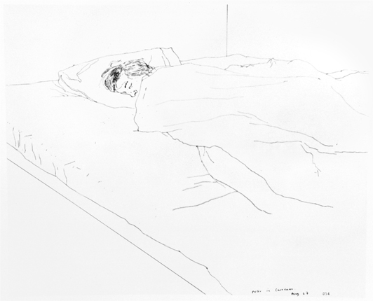 In the summer of 1966, Schlesinger had returned to Santa Cruz to continue his studies, and Hockney would visit him there at weekends, trips which were immortalised in a series of beautiful drawings, such as Peter in Santa Cruz, which demonstrate his ever-increasing skill with a line. Among these, perhaps the most sublime is Dream Inn, Santa Cruz, a touching portrait of Schlesinger asleep on a bed, the tranquillity and gentleness of which says everything about the happiness of the relationship. It is a remarkably accomplished drawing, in which he breathes life into his lover’s body with an astonishing economy of line. Hockney didn’t have to wait long for them to be permanently reunited, since Schlesinger was becoming increasingly disenchanted with the lack of any art teaching at Santa Cruz, and was missing Hockney. At the end of the term he made the decision to transfer down to UCLA, which he was able to do quickly thanks to the help of Hockney’s friend Bill Brice, an influential teacher there who pulled a few strings.