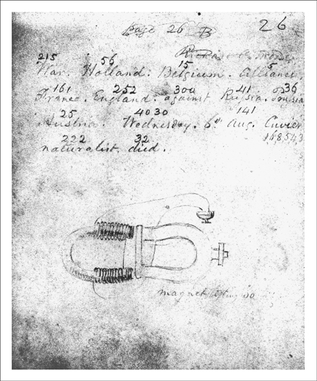 Some at least of Morse’s account is confirmed by the pocket-size sketchbook he kept aboard the Sully. What survives is only a certified copy of a certified copy of the original. But it has an authentic look and feel of Morse’s return from his three years abroad, containing sketches of Havre and notes for his Capitol rotunda painting of Columbus. Quite as Morse maintained, he evidently was preoccupied while at sea with thoughts of a telegraph system. He sketched some of its main elements: a tube for burying conducting wires under the earth and tall poles for stringing them above ground; an electromagnet actuating an armature to move a stylus against a roll of paper. He also composed a newsworthy dispatch to be sent by number-word code, perhaps his first conception of what a telegraph message might be like: “War. Holland. Belgium. Alliance. France. England. against. Russia. Prussia. Austria.”