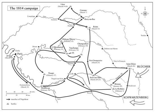 The Champagne region lies to the east of Paris and is crossed by the Seine, the Marne and the Aisne, river valleys that were the natural corridors for the Allied advance on the capital. The fighting there was to take place during the harshest winter in western Europe in 160 years; even the Russians were astonished at how cold it was. Hypothermia, frostbite, pneumonia, exhaustion and hunger were ever present. Typhus was again a particular concern, especially after a major outbreak at the Mainz camp. ‘My troops! My troops! Do they really imagine I still have an army?’ Napoleon told his prefect of police, Pasquier, at this time. ‘Don’t they realise that practically all the men I brought back from Germany have perished of that terrible disease which, on top of all my other disasters, proved to be the last straw? An army indeed! I shall be lucky if, three weeks from now, I manage to get together 30,000 to 40,000 men.’24 Nine of the campaign’s twelve battles were fought in an area of just 120 miles by 40 – half the size of Wales – on land that was flat and covered in snow, which was ideal country for cavalry, had he had any. Facing him were the two main Allied armies, Blücher’s Army of Silesia and Schwarzenberg’s Army of Bohemia, about 350,000 men. In all, the Allies fielded nearly a million troops.*
