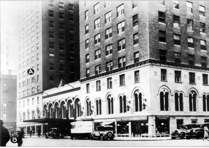 Above • The Park Central Hotel-"A" marks Room 349, "B" marks the spot on Seventh Avenue where the murder weapon was found. Courtesy Library of Congress.