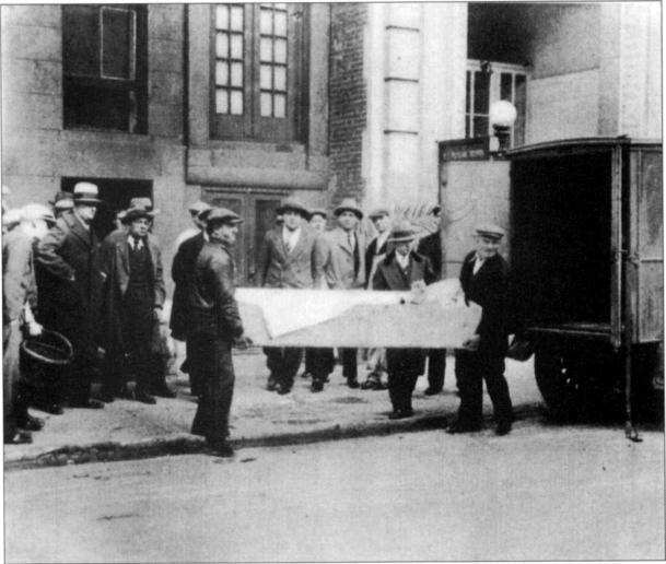 Rothstein's lifeless body being carried from the Polyclinic Hospital on the morning of November 5, 1928. Courtesy Library of Congress.