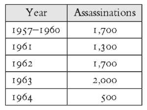 17 After Ngo Dinh Diem repudiated demands for all-Vietnam elections, the rate at which murders were committed seems to have increased. Although the government’s limited administrative control obscured much of what was going on, it is now generally thought that during the nine years that Diem was in power, close to twenty thousand people lost their lives to Communist insurgents. See Duncanson, Government and Revolution, 252.