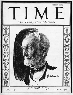 The first issue of Time magazine, in March 1923. The line drawing of the powerful Speaker of the U.S. House of Representatives Joseph Cannon was the first in a long tradition of portraying people on the cover. Soon after the magazine’s debut, it acquired its trademark red border, and a few years later it began using color portraits created by a group of artists commissioned by the magazine.