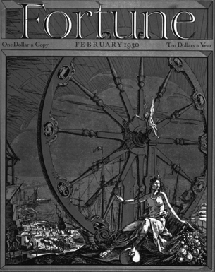 Luce promised that Fortune would be the most beautiful magazine ever published. Whether or not it achieved that goal, its design was undeniably impressive—and expensive—as was the magazine itself. The first cover, in February 1930, designed by Thomas Cleland—who had also chosen the typefaces and other design elements—showed a “wheel of fortune,” a symbol of the magazine itself and of the precariousness of fortune in the first year of the Great Depression.
