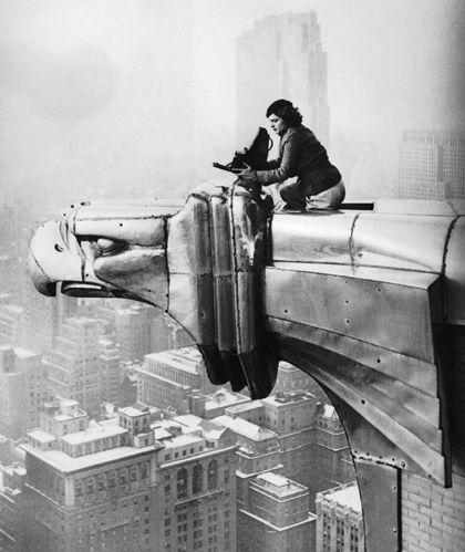 Margaret Bourke-White was the first woman to be hired full-time at Time Inc. as a photographer—and for that matter, the first woman to serve outside the clerical and research staffs at the company. She was intrepid, and eager for the world to know it—as this dramatic photograph of her perched with camera on a parapet of the Chrysler Building far above Manhattan illustrates.