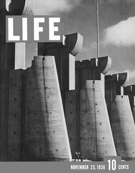 The first cover of Life magazine, 1936, featuring a dramatic Margaret Bourke-White photograph of the Fort Peck Dam in Montana. The picture’s monumentality drew immediate attention to the new magazine and helped make it an immediate, sensational success. Bourke-White was the first great celebrity among Life photographers, but she was soon accompanied by a large retinue of equally talented (and in some cases equally famous) colleagues.
